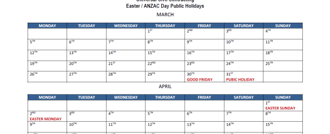 Easter and ANZAC Day 2018 – UCC Public Holiday Dates